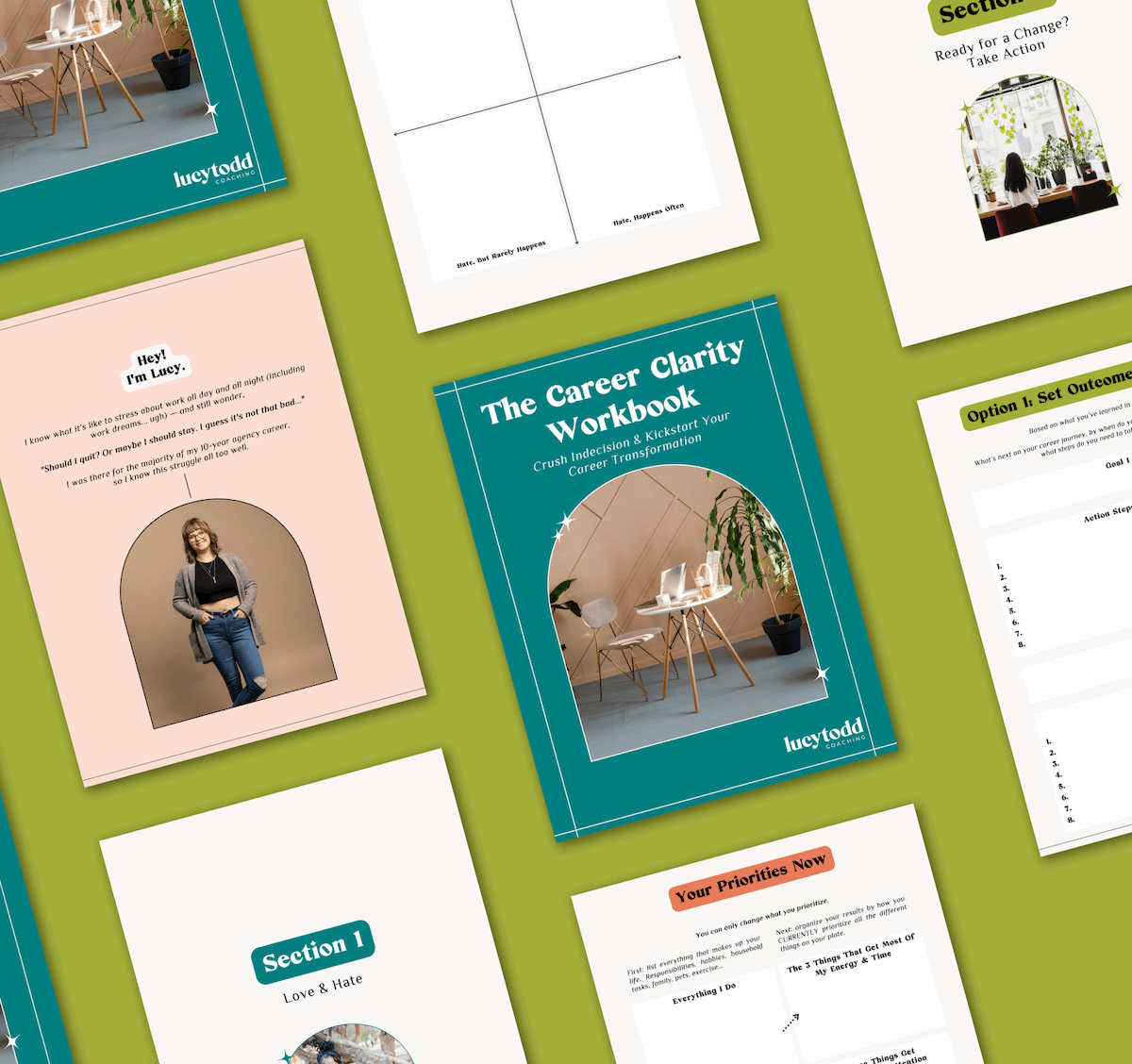 Green background with individual pages of the career transformation guide, The Career Clarity WorkbookCareer Clarity Workbook